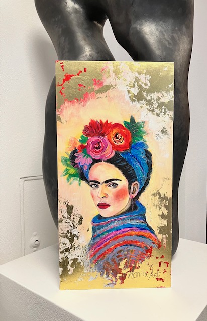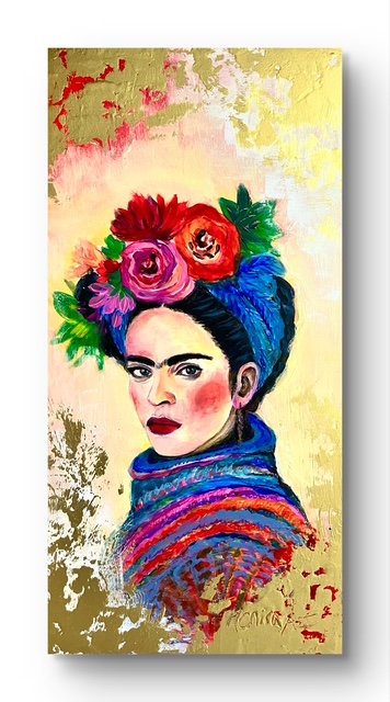 The gold highlights their colorful shape and enhances the luminosity of the colors without masking them. The flowers stand for life, growth and hope, framing Frida’s face like a crown.
